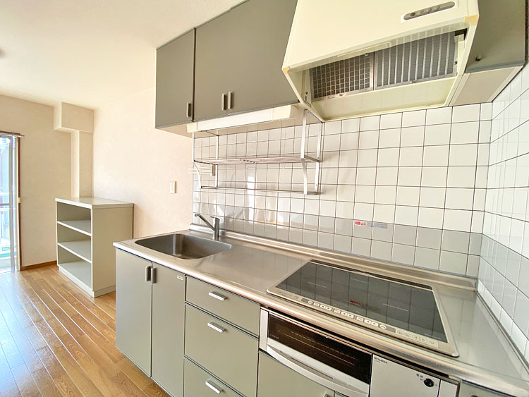 キッチン横の棚は造り付けで動かせませんので、便利にお使いください。