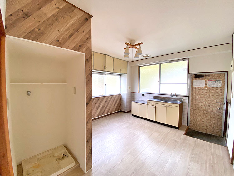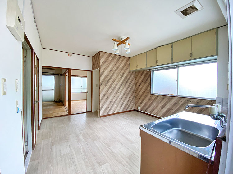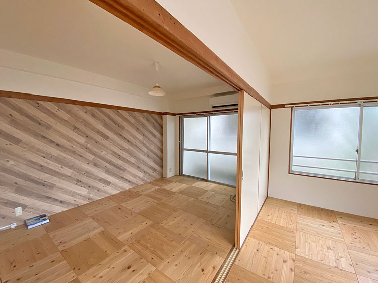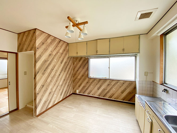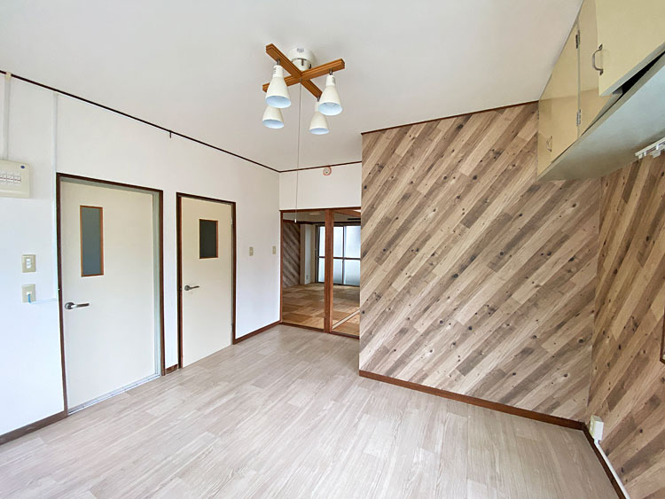 キッチンと洋室の一部にアクセントクロスとして使用した木目柄の壁紙が目を引きます。