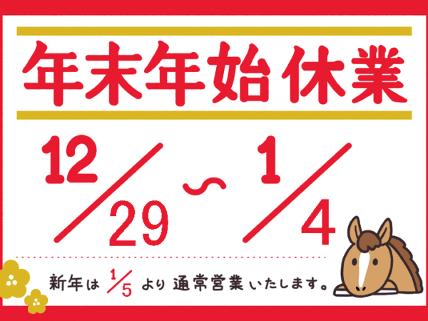 平素は格別のお引き立てを賜り厚く御礼申し上げます。 誠に勝手ながら下記期間を休業とさせていただきます。 12月29日(月)~1月4日(日) 新年は1月5日(月)より通常営業いたします。 来年も皆様にと …